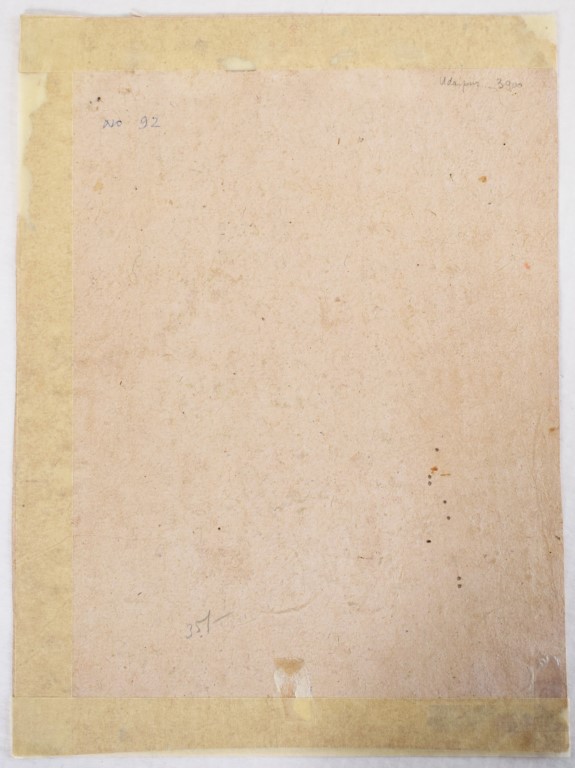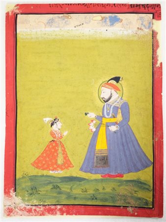Gouache e oro su carta, raffigurante il sovrano, probabilmente un ritratto postumo di Sangram Singh II (r. 1710 - 1734) nel suo profilo sinistro colto nell'atto di offrire del pan all'erede al trono. L'alto lignaggio del personaggio è sottolineato dall'aureola dorata fiammeggiante intorno al suo capo.