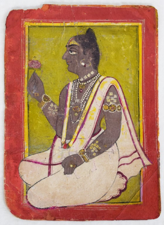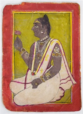 Gouache su carta raffigurante un brahmino in ginocchio, ritratto nel suo profilo sinistro con un fiore nella sua mano destra. Abbigliato con il tradizionale dhoti, il sacerdote mostra numerosi ornamenti da braccio e collane.