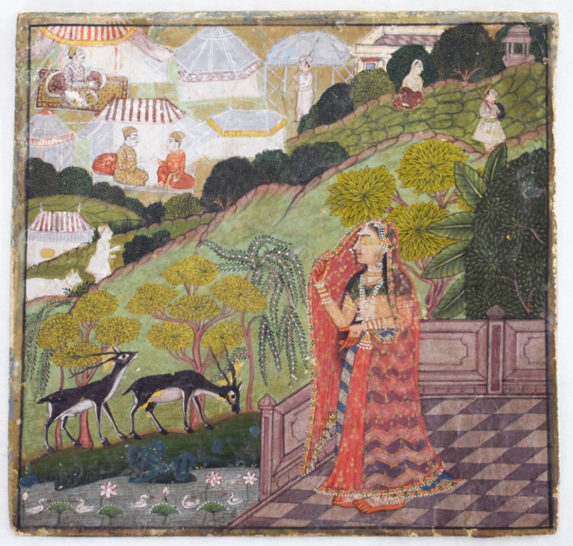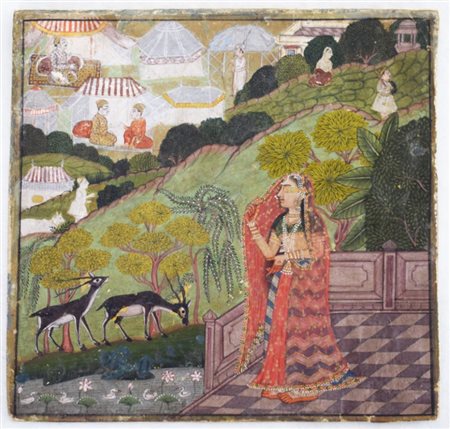 Gouache su carta raffigurante una donna che guarda fuori dalla terrazza di un palazzo. La composizione è sbilanciata ma le proporzioni dei personaggi danno conto della loro vicinanza sul piano prospettico. Sappiamo quindi che la protagonista del dipinto è la fanciulla sulla destra e percepiamo una vita quasi frenetica fuori dall'edificio, con personaggi minori intenti in diverse attività in quello che sembra un accampamento. La natura rigogliosa e le due antilopi in primo piano sembrano descrivere un momento di tranquillità.