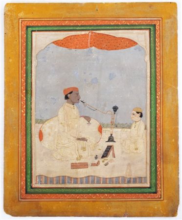 Gouache su cartoncino, raffigurante un sovrano non identificato, caratterizzato da carnagione scura. Egli è colto in un momento di svago, mentre fuma la pipa ad acqua su una terrazza, in compagnia di un attendente.
