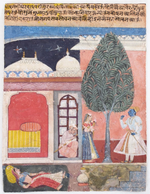 Gouache su cartoncino, forse parte di un Ragamala, ma non identificato nel testo in devanagari, arrangiato su tre righe nella porzione superiore del dipinto.