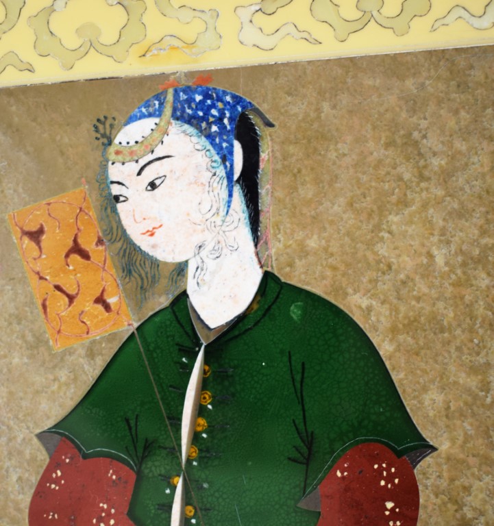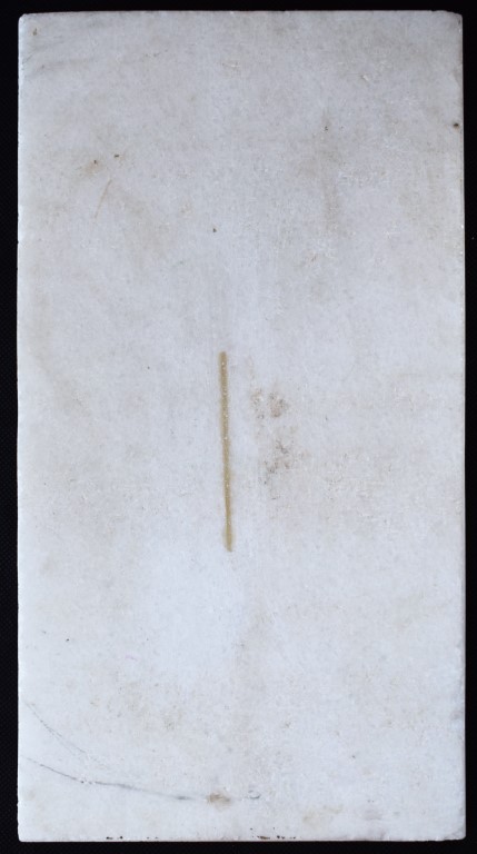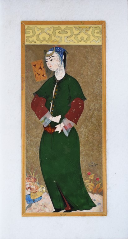 Lastra di marmo bianco finemente intarsiata con pietre dure a formare un ritratto in stile safavide. Il giovane è ritratto in postura stante su sfondo quasi interamente monocromo, secondo la consuetudine degli album di ritratti diffusasi in Iran a partire dal XVII secolo. La porzione superiore è decorata con un fascio di nubi di derivazione cinese. Firma illeggibile a destra della figura.