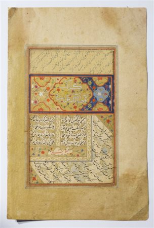 Testo in persiano su carta successivamente applicata su cartoncino. Testo in calligrafia naskh e nastaaliq arrangiato in più registri e corredato di decorazioni floreali policrome e interlinea dorata nella porzione centrale. Il cartiglio centrale reca il titolo in riserva su fondo dorato decorato a motivo di arabeschi stilizzati, mentre la porzione a destra del titolo è miniata su sfondo blu cobalto. Il corpo del testo centrale è composto in versi, con struttura poetica e lessico persiano in tono moraleggiante. Le sezioni inclinate e marginali proseguono lo stesso testo o lo accompagnano con glosse.