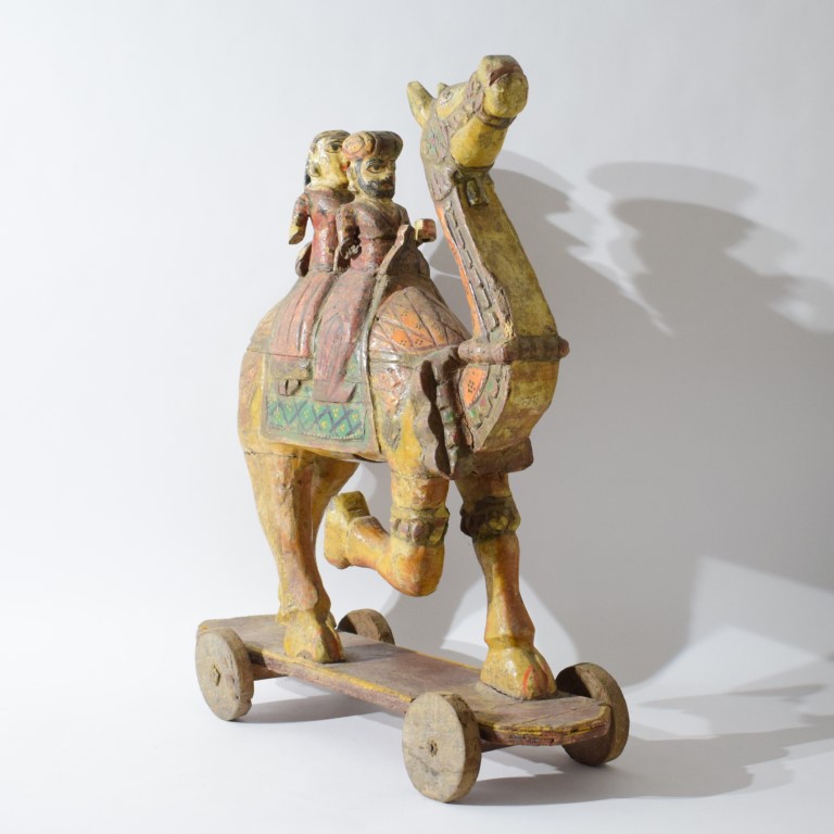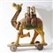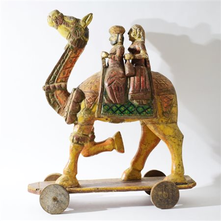 Sopra pedana trasportabile con quattro ruote si erge un cammello con una delle zampe sollevate a mimare un'andatura sostenuta. In sella un coppia: lei reca una bottiglia nella sua mano sinistra, lui probabilmente in origine trasportava una lancia, ora persa.
