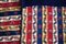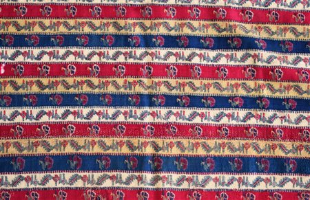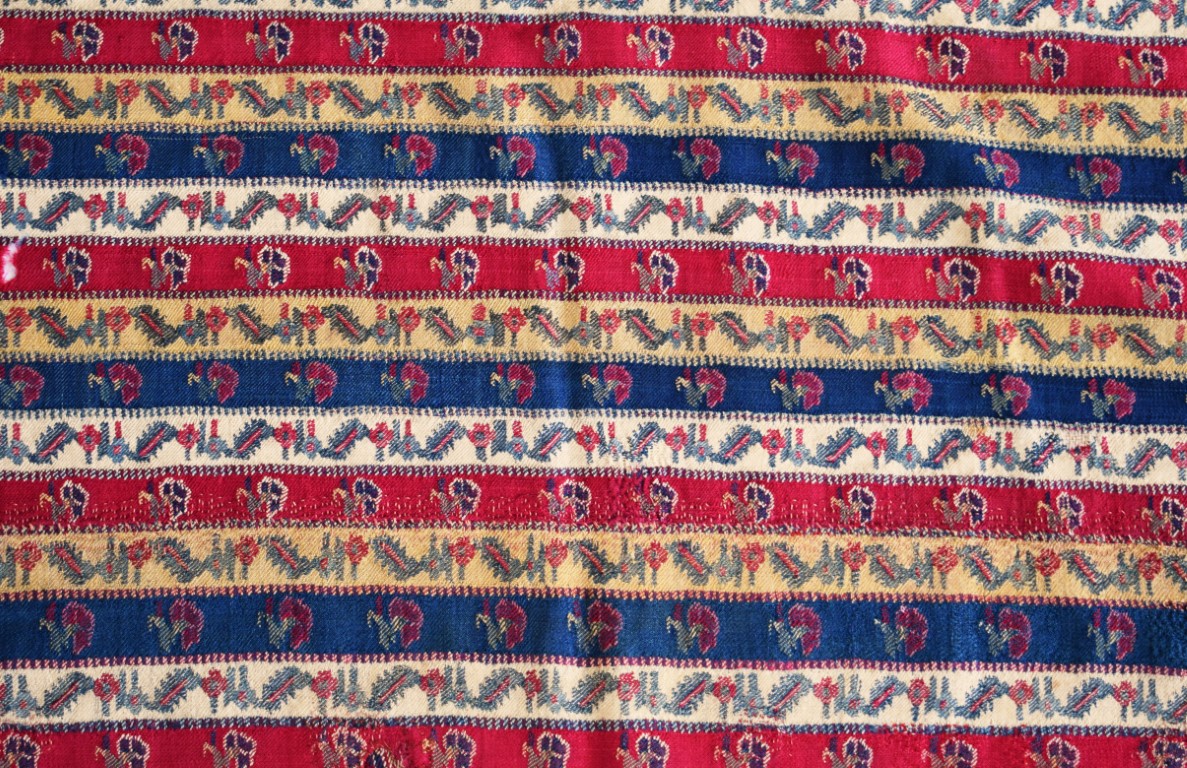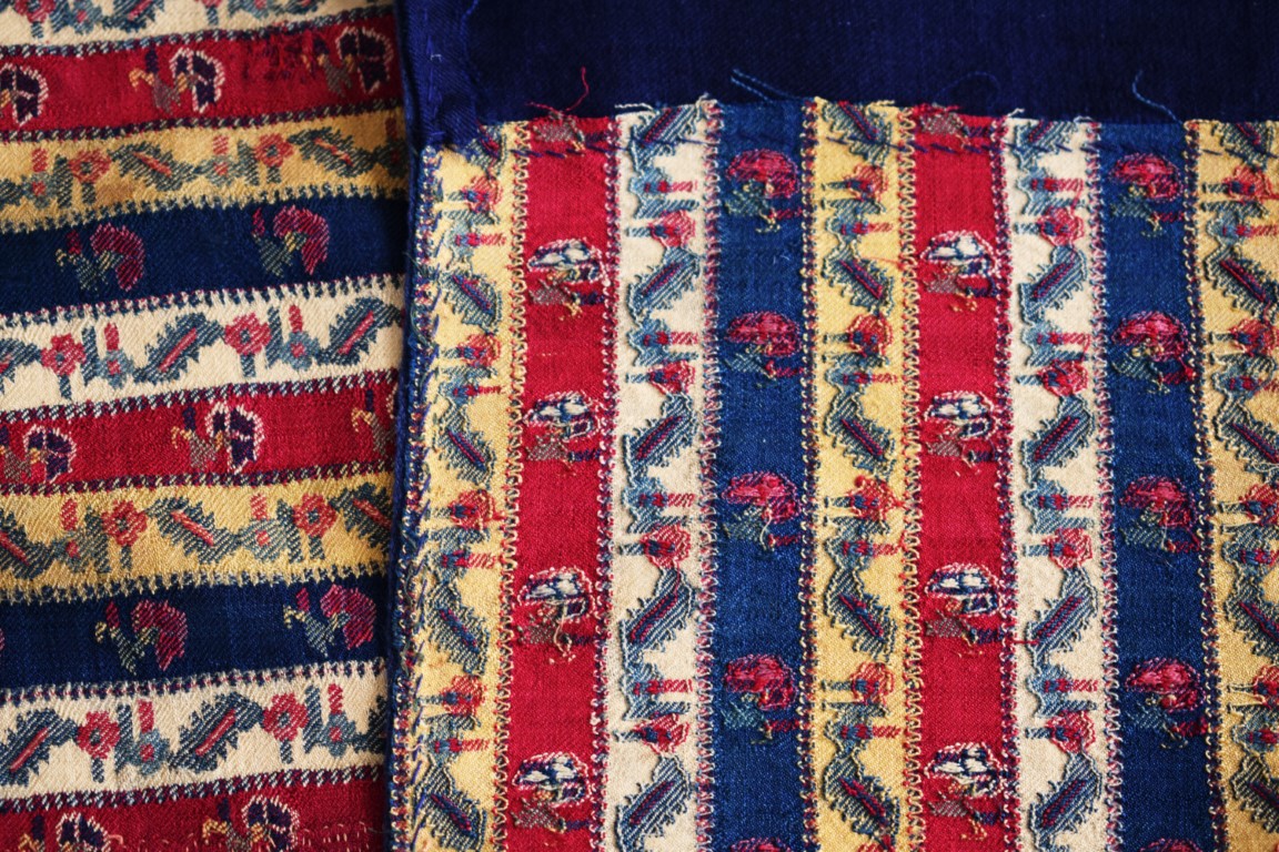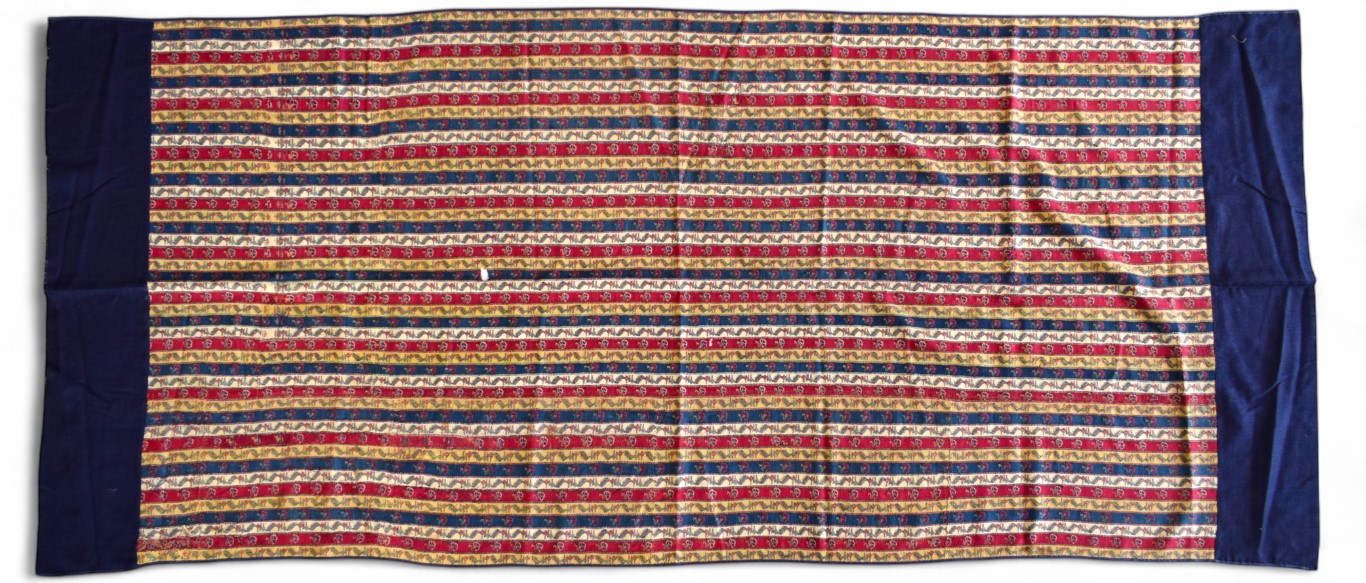 Frammento di un lungo scialle in lana (Khatraaz Dochalla) decorata con piccoli motivi floreali stilizzati e foglie di buta ripetute entro strisce verdi, bianche, gialle e blu.