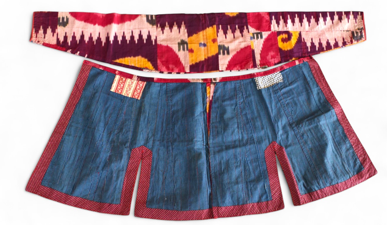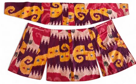 Set di due pezzi, forse non completo, composto da un coprispalla tubolare con aperture solo all'altezza dei polsi ed una gonna regolabile adoperando i bottoni all'altezza della vita.