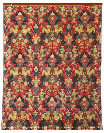 Montato come ornamento da parete, decorato con coppia di leoni che affianca un albero stilizzato, personaggi a cavallo, elaborati edifici con cupole, piante e fiori. I colori sono brillanti e comprendono i toni del rosso, verde e blu.