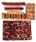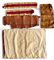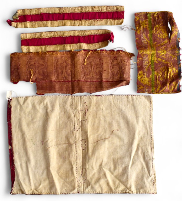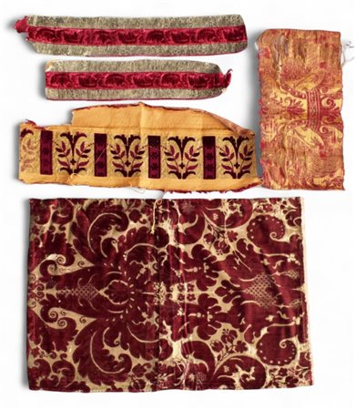 Quattro velluti e un tessuto damasco in seta, alcuni in origine forse paramenti liturgici, decorati con arabeschi intrecciati e motivo floreale orientalista.