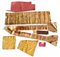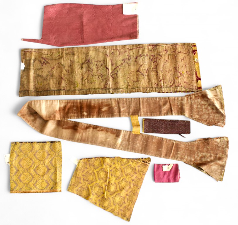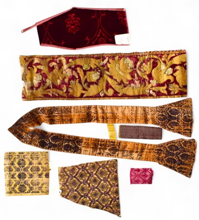 Frammenti di tappezzeria e frammenti di paramenti liturgici in velluto decorato con ogive intrecciate, elementi vegetali ed arabeschi di ispirazione ottomana. Alcuni recano etichette precedenti collezioni.