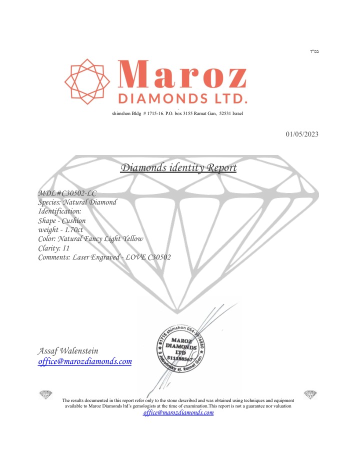 DIAMANTE NATURAL POLISHED 1,7 N.F. FANCY GIALLO CHIARO -I1 - Laser Engraved+ID - C30502-LC