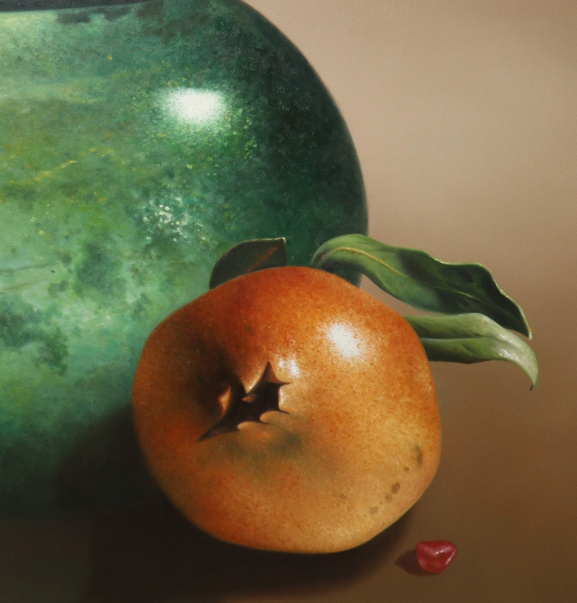 Antonio Sciacca (Catania 1957) - Natura morta con vaso verde e melograno cm 79,5X88,5 in cornice cm 81X90 Firmata in basso a destra. Sul retro OPERA DA ME ESEGUITA ANTONIO SCIACCA. Corredata da foto durante la realizzazione dell'opera.Firmata in basso a destra. Sul retro OPERA DA ME ESEGUITA ANTONIO SCIACCA. Corredata da foto durante la realizzazione dell'opera.