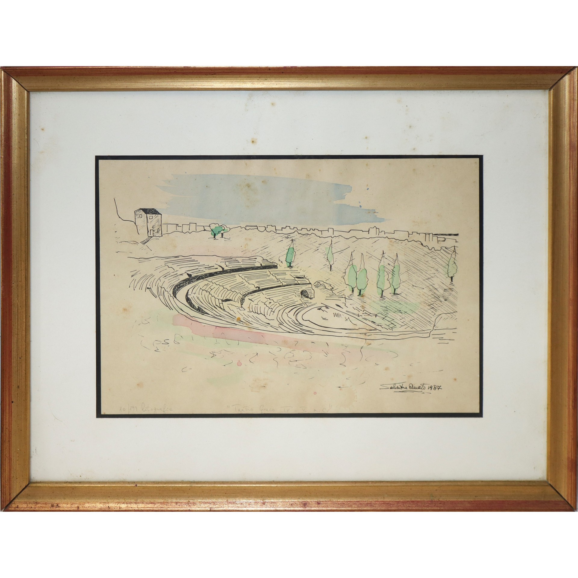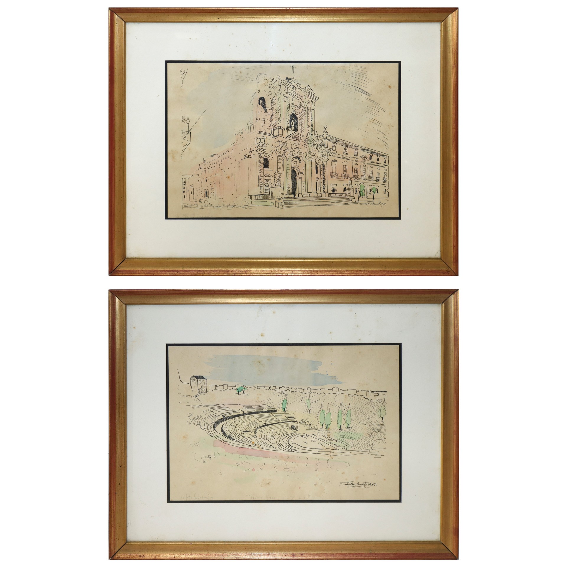 Coppia di disegni acquerellati raffiguranti Teatro Greco e Cattedrale Santa lucia di Siracusa, Firmato Salvatore Amato