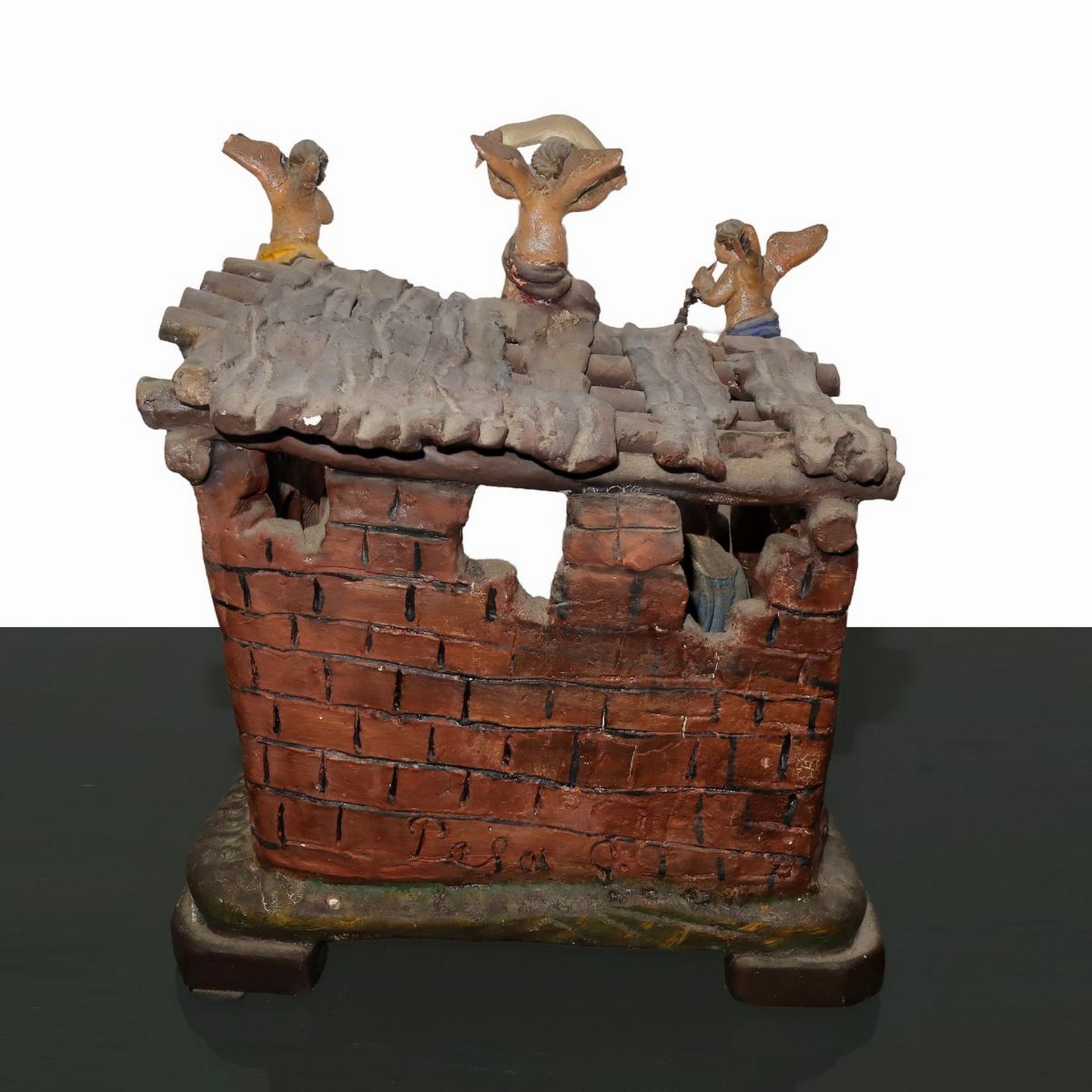 Presepe in ceramica policroma di Caltagirone con pastori e angeli, 20° secolo H cm 30x27x22