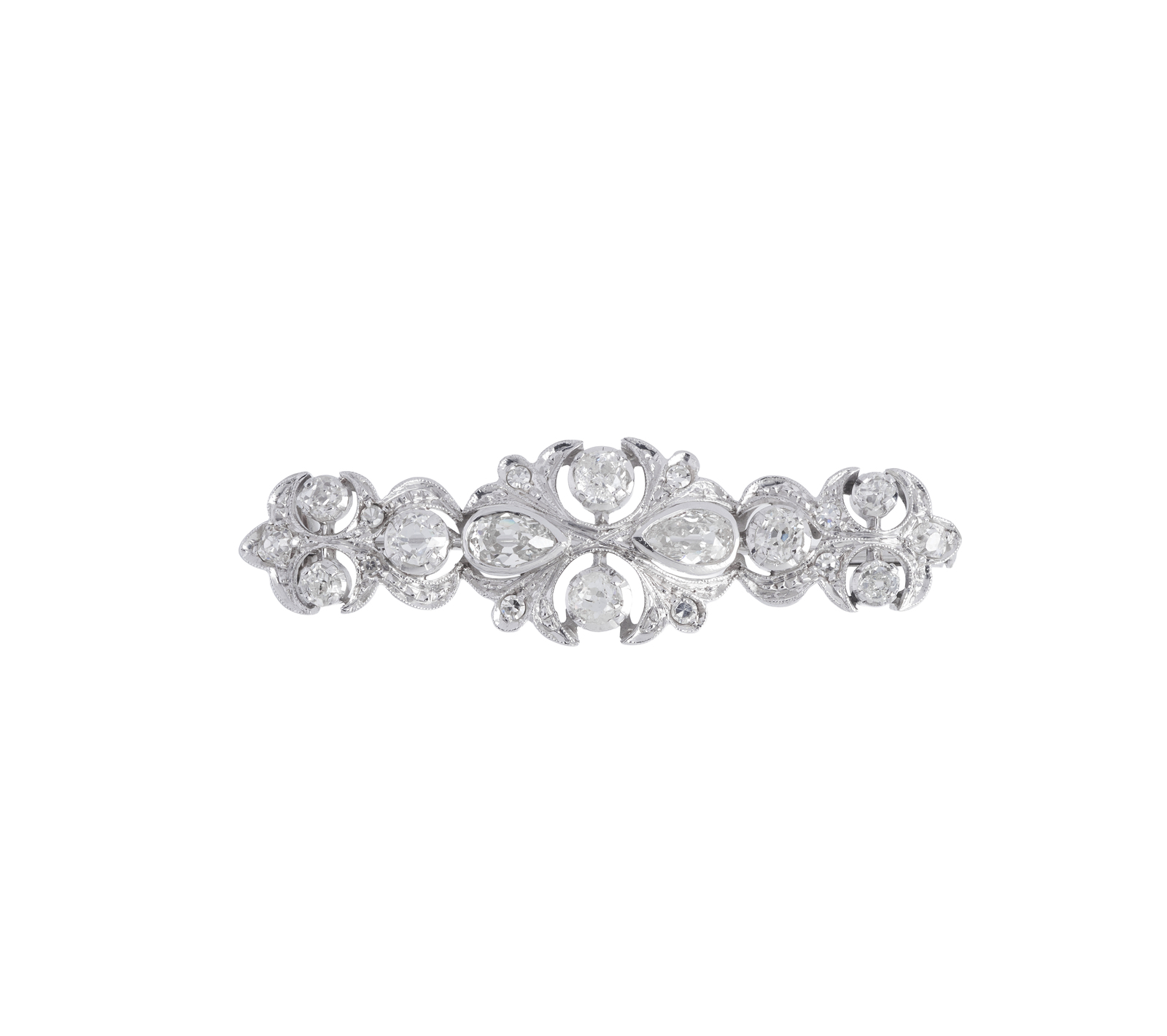 Spilla in platino con diamanti . . Cm 5,00 x 1,50. Diamanti taglio antico: 2.50 ct. circa