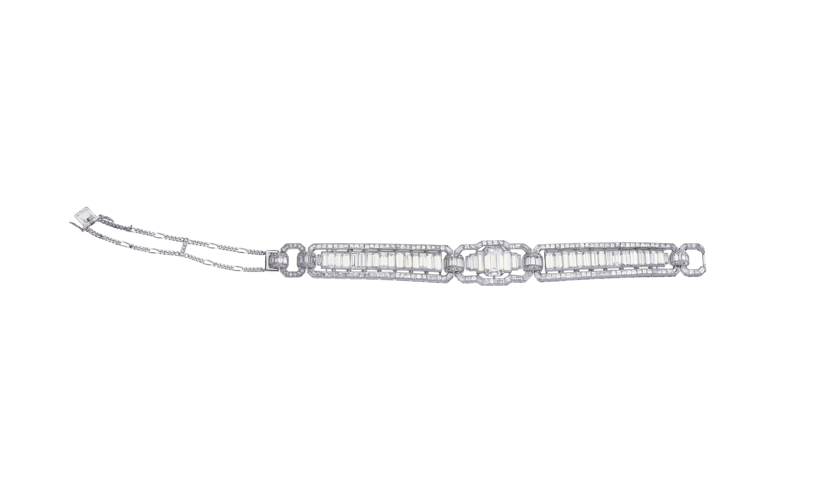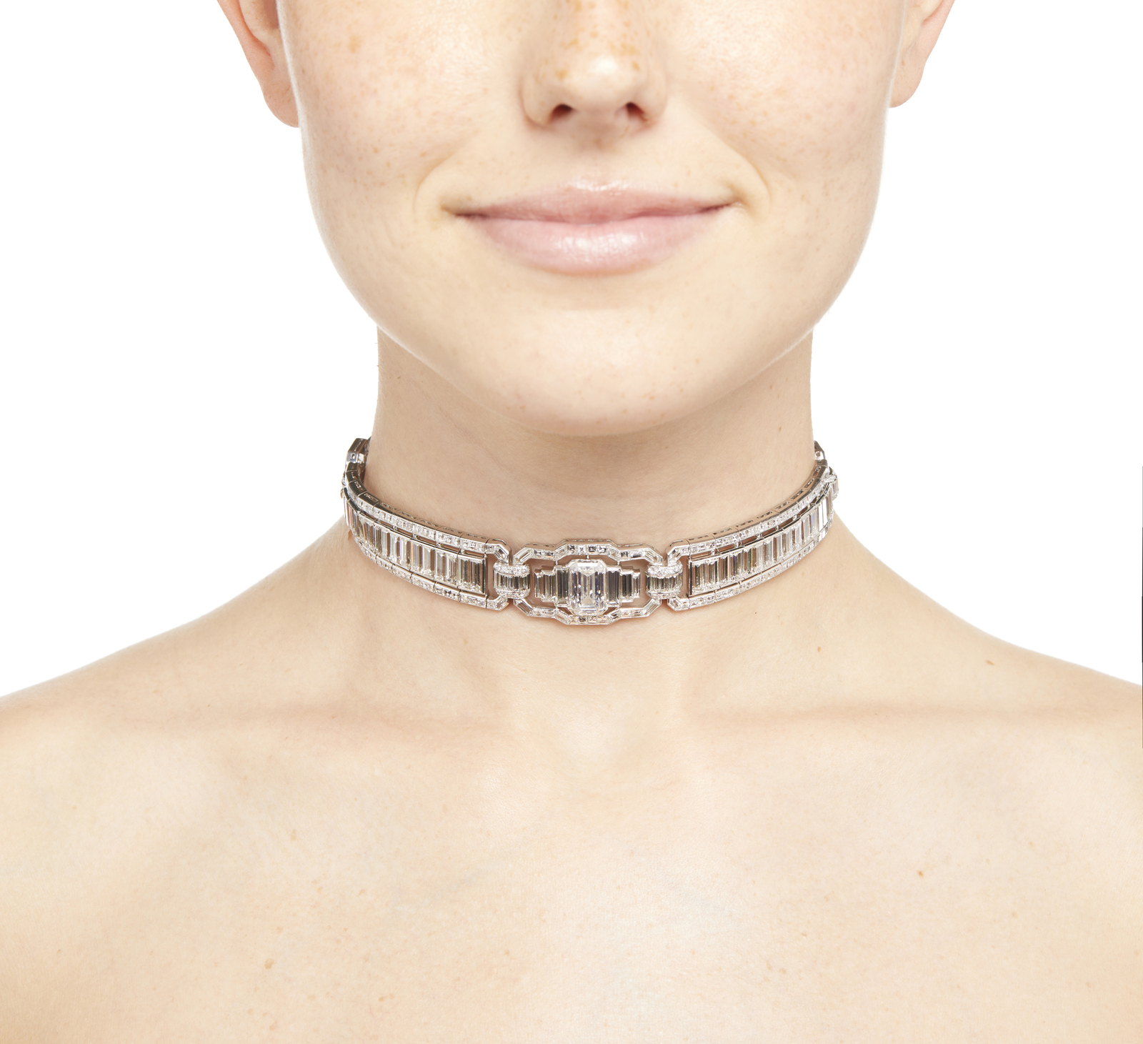- Collarino in platino con diamanti taglio baguette, taglio a smeraldo e taglio a brillante.