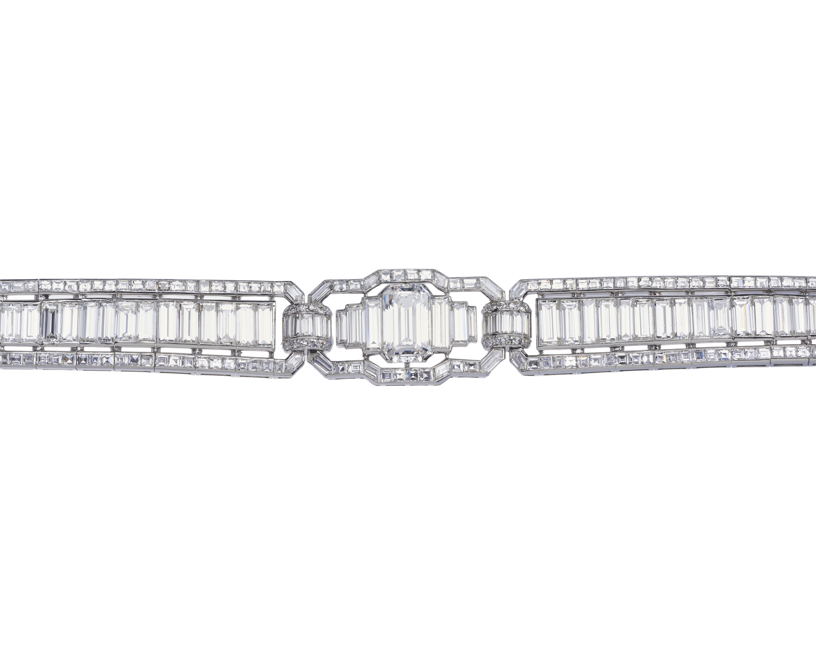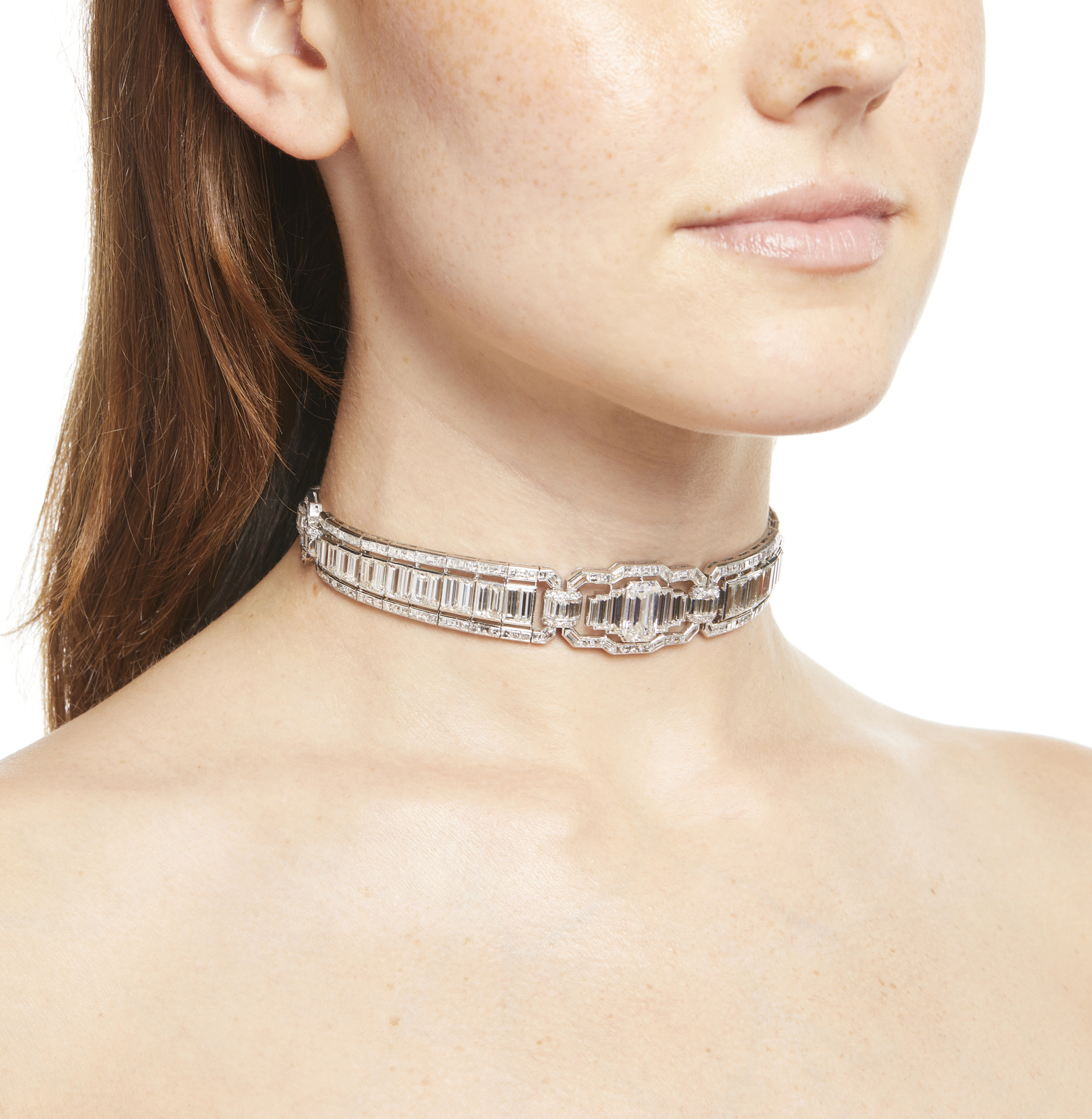 Lot 213 | - Collarino in platino con diamanti taglio baguette, taglio a smeraldo e taglio a brillante.