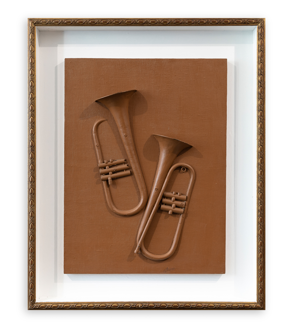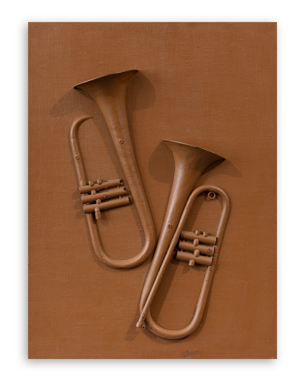 Trombetta tagliata montata su tela dipinta con colori acrilici, riportata su tavola