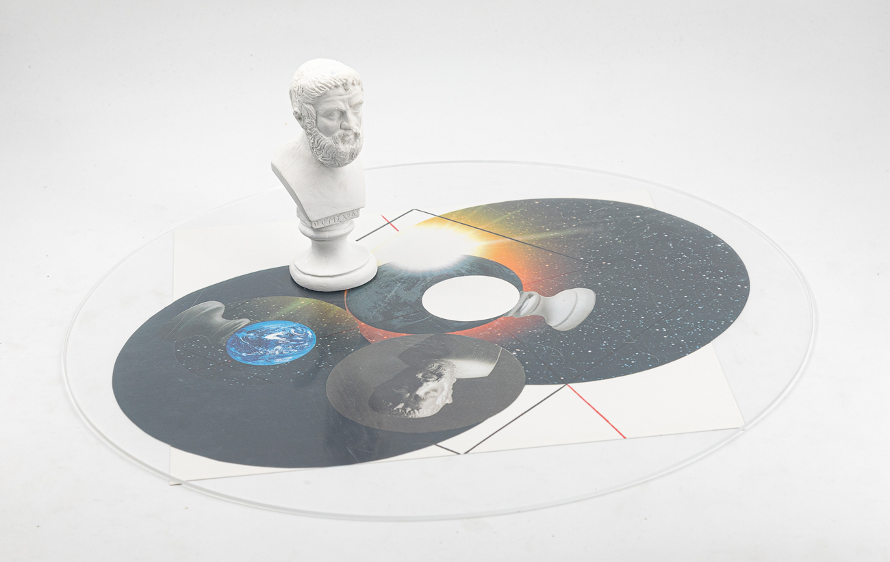 Multiplo composto da 1 stampa litografica a colori su cartoncino fustellato (cm 34x41), 1 lastra di plexiglass trasparente (diam. cm 47) e 1 calco in gesso (cm 14,5)