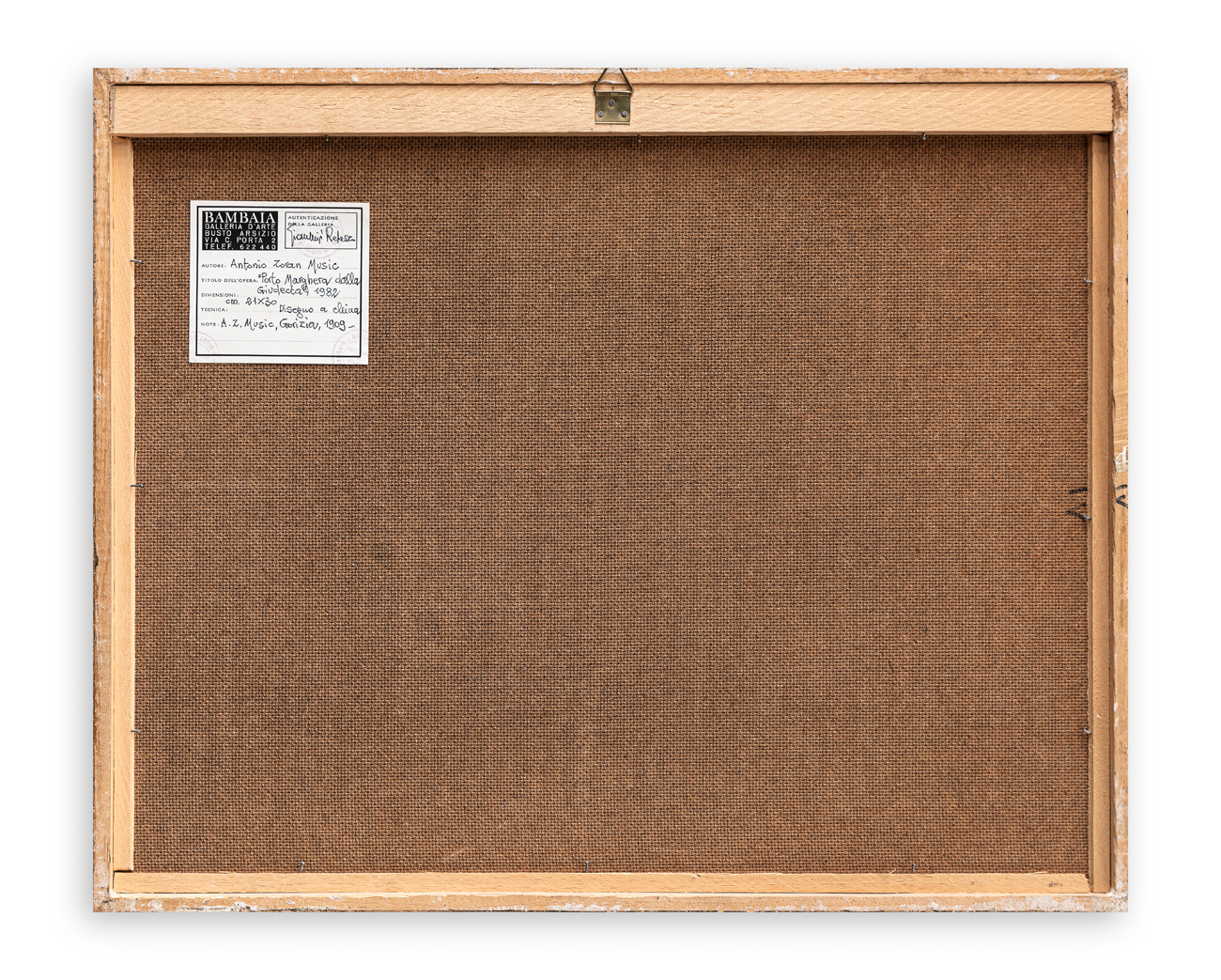 Etichetta della Galleria Bambaia (VA), con caratteristiche tecniche dell'opera, al retro della masonite protettiva
