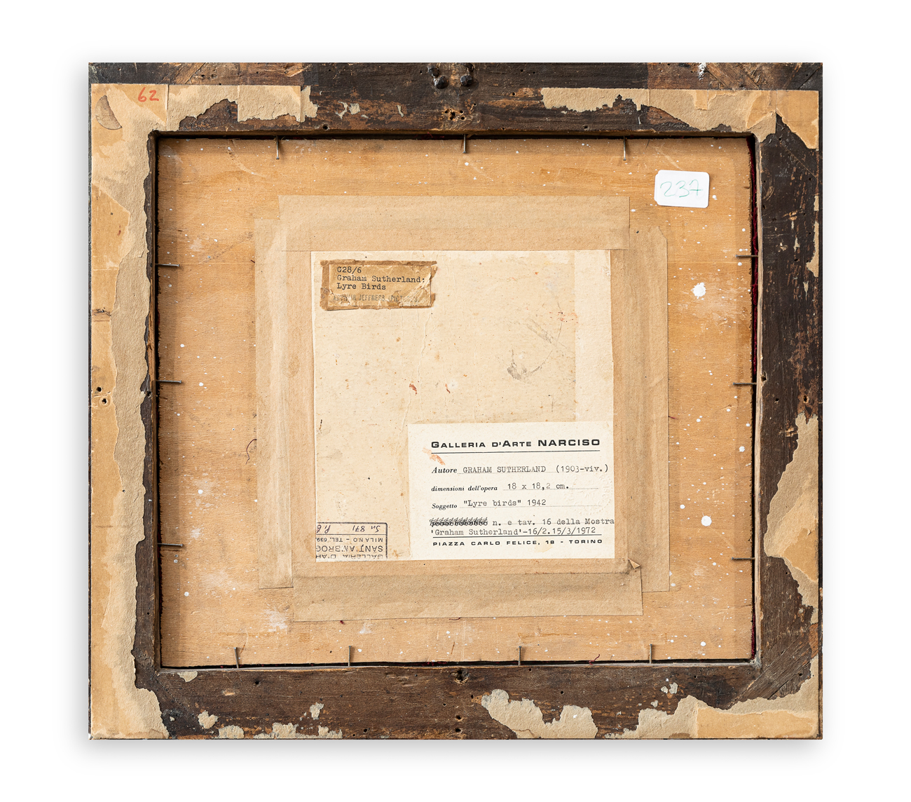 Etichetta della Galleria d'Arte Narciso (TO) con caratteristiche tecniche dell'opera al retro