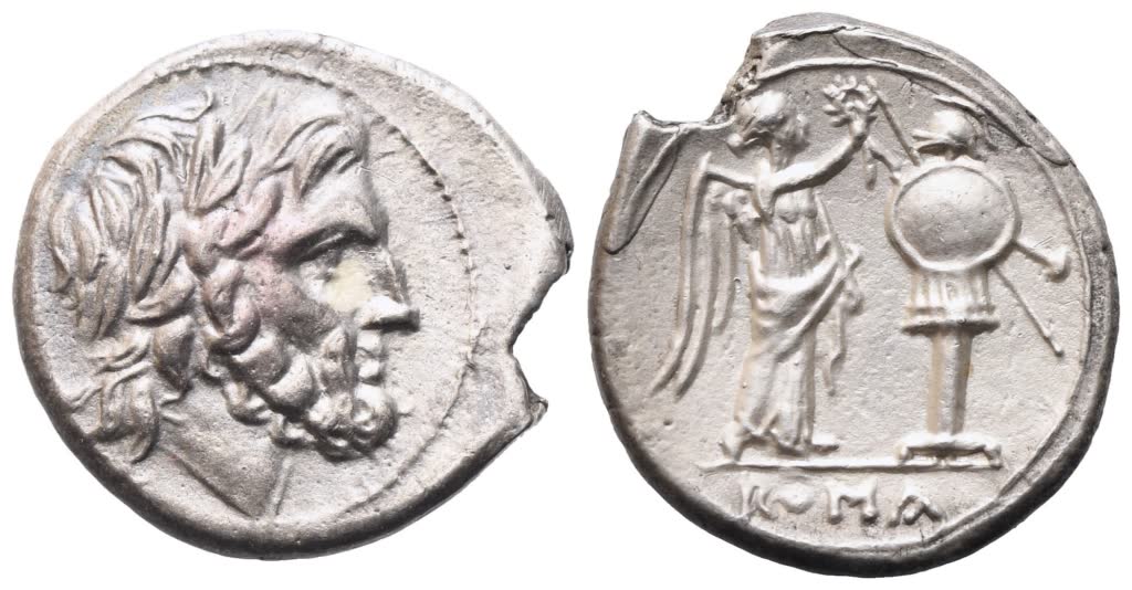 Laureate head of Jupiter r.; Rv. Victory standing r., crowning trophy; in exergue, ROMA. Crawford 70/1; BMCRR Italy139; Sydenham 83; Debernardi V2. Good extremely fine. Lustrous.