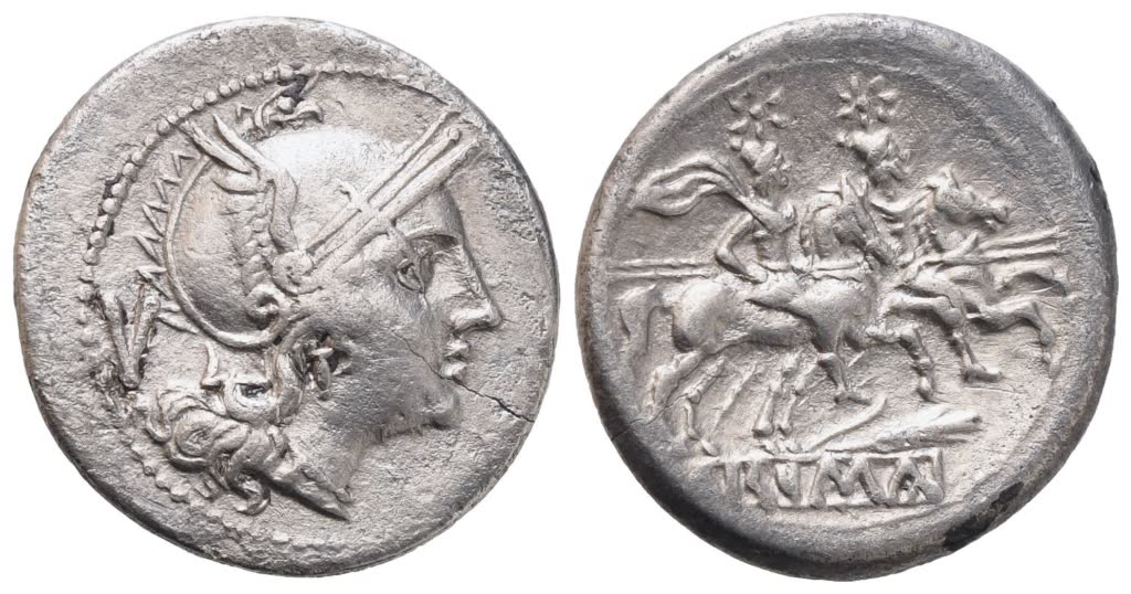 Uncertain Sicilian mint (Debernardi). Helmeted head of Roma r.; V (mark of value) behind head; Rv. Dioscuri on horseback r., each holding spear, ; two stars above, grain ear below. Crawford 72/4; King 11; RBW 306; RSC 2; Debernardi Bq37. Slight porosity; crack at 4 o'clock on the obverse, otherwise about extremely fine.