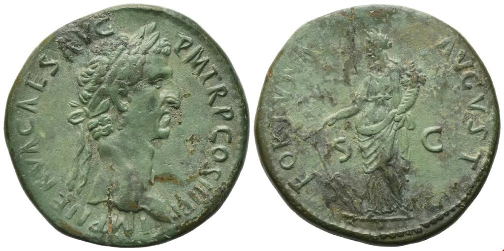 IMP NERVA CAES AVG P M TR P COS III P P Laureate head r.; Rv. FORTVNA AVGVST / S – C Fortuna standing l. holding rudder and cornucopia. RIC 83; Cohen 67. Wonderful green patina; untouched. A charming specimen, bearing a bold portrait of Nerva. Extremely fine / about extremely fine.