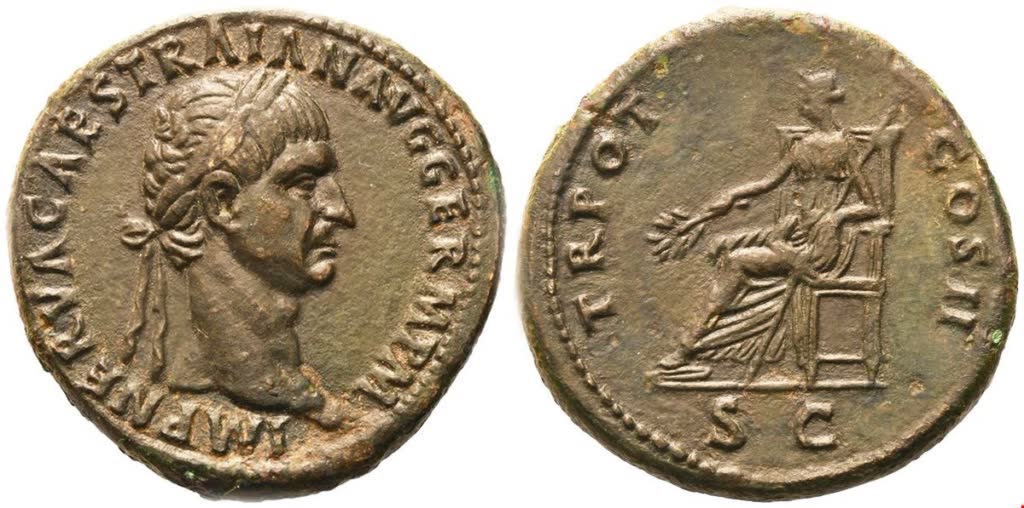 IMP NERVA CAES TRAIAN AVG GERM P M Laureate bust of Trajan to r.; Rv. T4R POT COS II Pax seated l., holding branch and sceptre. RIC 391; Cohen 611. Dark brown patina with green hues. Wonderful early portrait of Trajan, with features resembling Nerva. Gently cleaned, otherwise good extremely / extremely fine.