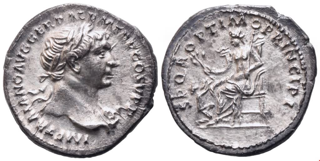 IMP TRAIANO AVG GER DAC P M TR P COS V P P Laureate bust right, slight drapery on far shoulder; Rv. SPQR OPTIMO PRINCIPI Pax seated l., holding branch and sceptre; at her feet, a kneeling Dacian. RIC 188; Cohen 417. Minor scratches on the obverse, otherwise near extremely fine.