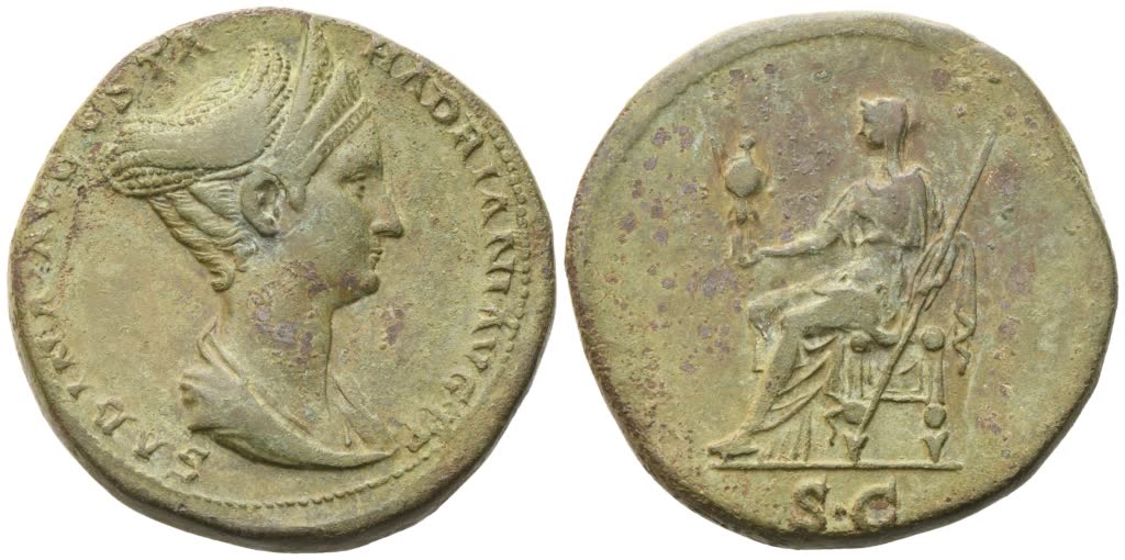 SABINA AVGVSTA HADRIANI AVG PP Draped bust of Sabina r., wearing stephane; Rv. Vesta seated l., holding palladium and sceptre; in exergue, S·C. RIC II 1034 Cohen 67. A charming example, bearing a lovely green patina. Delicate portrait of refined style. Near extremely fine / good very fine.