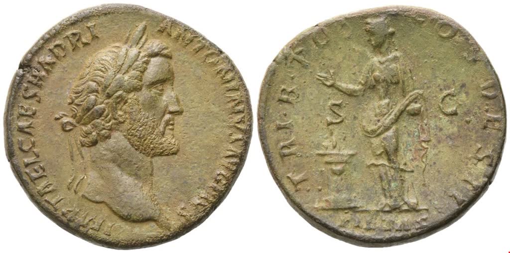 IMP T AEL CAES HADRI - ANTONINVS AVG PIVS, bare head r., Rv. TRIB POT - COS DES II, Pietas standing l. by altar; in field, S - C; in exergue, PIETAS. RIC 523 var. Lovely green patina with brownish hues. Extremely fine.