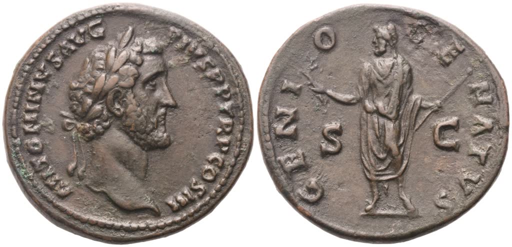 ANTONINVS AVG PIVS P P TR P COS III Laureate bust r.; Rv. GENIO SENATVS / S - C Genius of the senate standing facing, head l., holding branch and sceptre. RIC 605; Cohen 400 corr. (reverse legend); BMC 1241. Chocolate brown patina. About extremely fine.