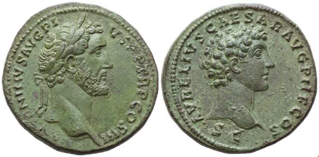 ANTONINVS AVG PIVS P P TR P COS III Laureate head of Antoninus Pius r.; Rv. AVRELIVS CAESAR AVG PII F COS Bare head of Marcus Aurelius right. RIC 1211 var. (head bare); Cohen 28 var. (head bare). Extraordinary untouched green patina. Exceptional detail. Among the finest specimens known. Good extremely fine.