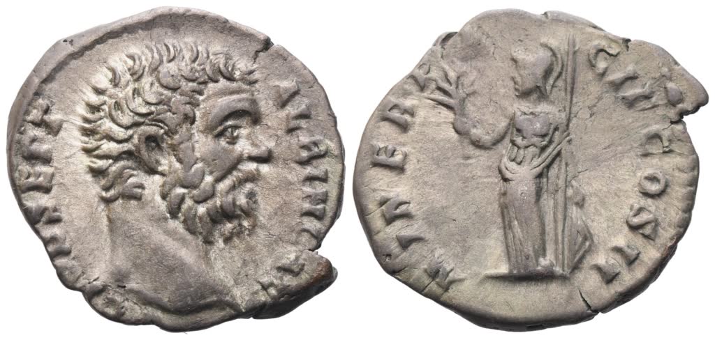 D CLOD SEPT ALBIN CAES Head of Clodius Albinus to r.; Rv. MINER PACIF COS II Minerva standing facing, head l., holding olive branch, shield and spear. RIC 7; Cohen 48. About extremely fine / good very fine.