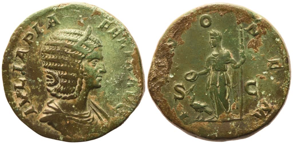 IVLIA PIA FELIX AVG Draped bust of Julia Domna to r., wearing stephane; Rv. IVNONEM / S C Juno standing l., holding patera and sceptre; at feet to l., peacock. RIC 585a (Caracalla); Cohen 90. Rare. Appealing brownish green patina with earthy encrustations. Fine portrait with stern expression, displaying power and authority. Near extremely fine.