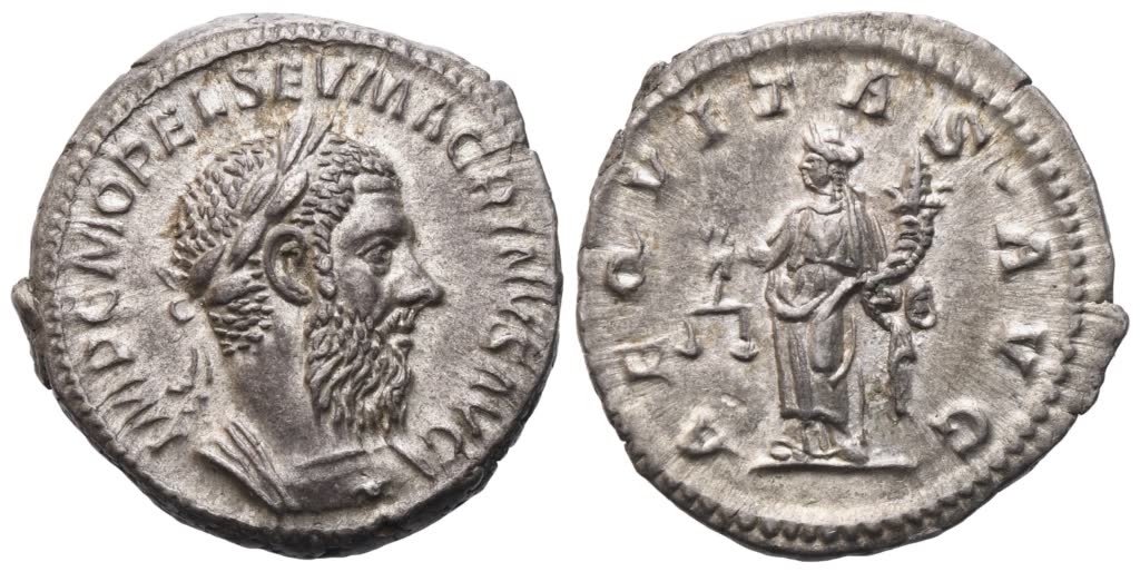 IMP C M OPEL SEV MACRINVS AVG Laureate and draped bust of Macrinus to r.; Rv. AEQVITAS AVG Aequitas standing front, head to l., holding scales in her r. hand and cornucopia in her l. RIC 53; Cohen 2. Good extremely fine.