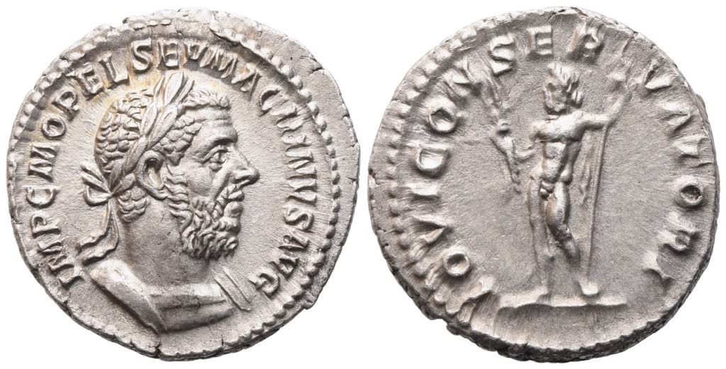 IMP C M OPEL SEV MACRINVS AVG Laureate and cuirassed bust of Macrinus to r.; Rv. IOVI CONSERVATORI Jupiter, naked, standing front, head to l., holding thunderbolt in his r. hand and long sceptre with his l. RIC 73; Cohen 33. Near extremely fine.