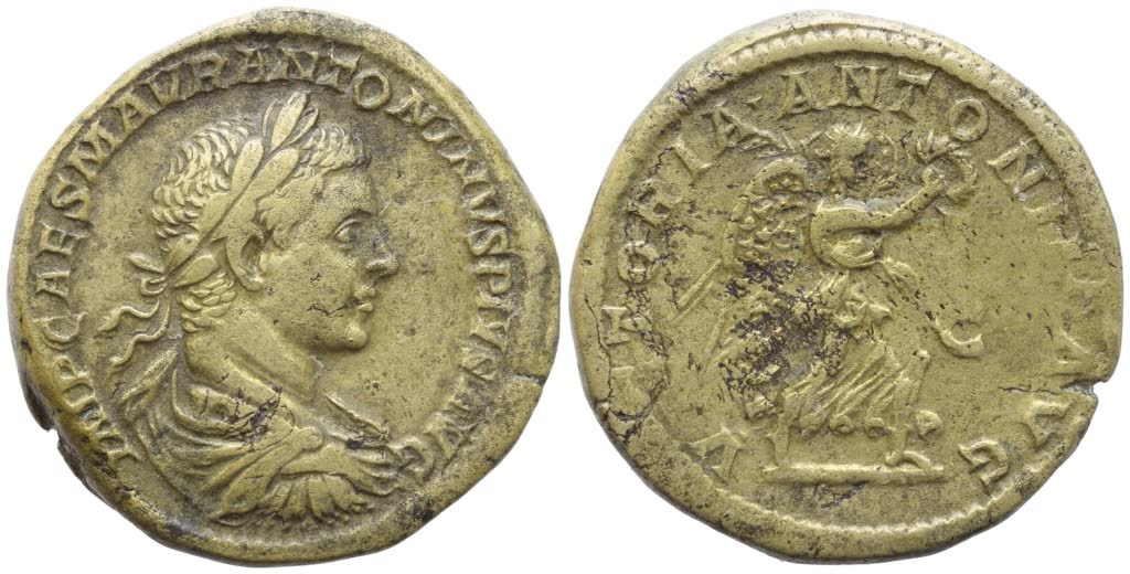 IMP CAES M AVR ANTONINVS PIVS AVG Laureate, draped and cuirassed bust of Elagabalus to r.; Rv. VICTORIA ANTONINI AVG/  S – C Victory advancing r., holding wreath and palm. RIC 377; Cohen 297. Rare. Attractive riverine tone. Good very fine.