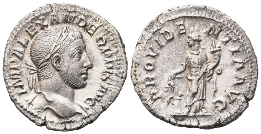 IMP ALEXANDER PIVS AVG Laureate bust r., slight drapery over far shoulder; Rv. PROVIDENTIA AVG Providentia standing facing, head l., holding grain ears over modius and cornucopia. RIC 250; Cohen 501b. Good extremely fine.