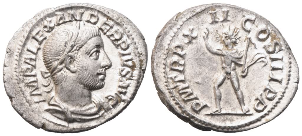 IMP ALEXANDER PIVS AVG Laureate and draped bust r.; Rv. PM TR P XII COS III PP Sol walking l., holding whip and raising r. hand. RIC 120; Cohen 440. Good extremely fine.