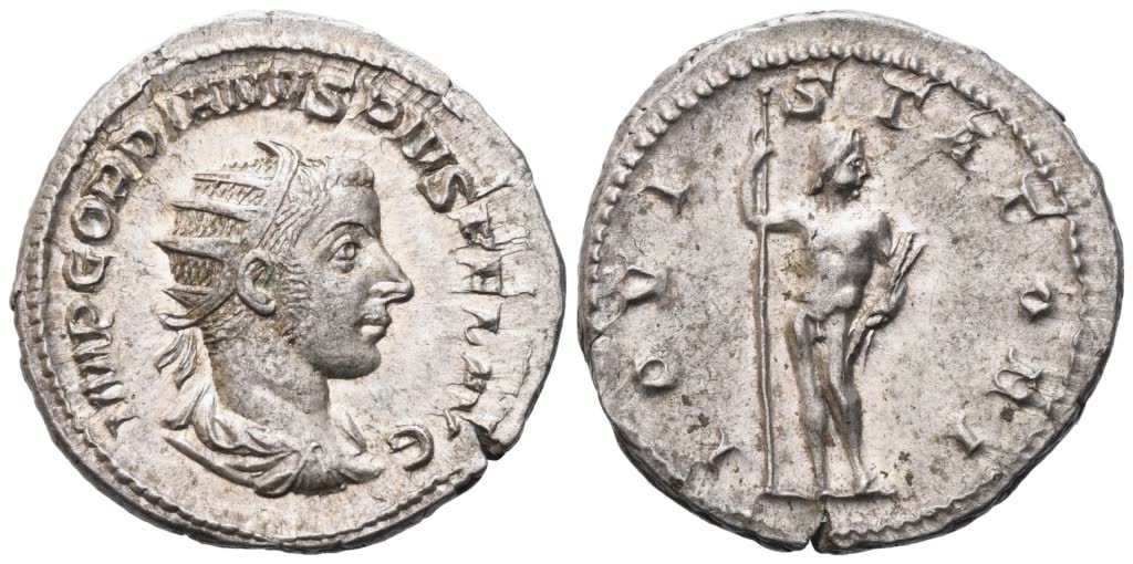 IMP GORDIANVS PIVS FEL AVG Radiate, draped and cuirassed bust of Gordian III to r.; Rv. IOVI STATORI Jupiter standing front, head to r., holding sceptre in his r. hand and thunderbolt in his l. RIC 84; Cohen 109. Good extremely fine.