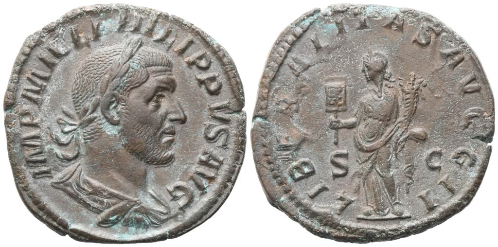 IMP M IVL PHILIPPVS AVG Laureate, draped and cuirassed bust r.; Rv. LIBERALITAS AVGG II Liberalitas standing l., holding abacus and cornucopia; S – C across fields. RIC 180a; Cohen 88. Appealing brown patina with green hues. Extremely fine.