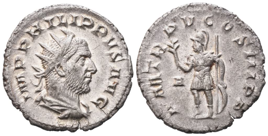 IMP PHILIPPVS AVG Radiate, draped and cuirassed bust of Philip I to r.; Rv. P M TR P V COS III P P Mars standing front, head to l., holding branch in his r. hand and resting l. hand on shield set on ground, spear leaning against his l. arm; in field to left, A. RIC 7; Cohen 145. Extremely fine.
