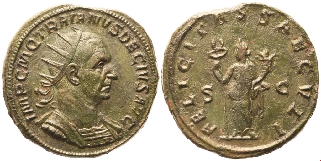 IMP C M Q TRAIANVS DECIVS AVG Radiate and cuirassed bust r., with drapery on l. shoulder; Rv. FELICITAS SAECVLI / S – C Felicitas standing l., holding caduceus and cornucopia. RIC 115; Cohen 39. A bold portrait of excellent style struck on a very large flan and a beautiful untouched green patina with some red hues. Good extremely fine / about extremely fine.