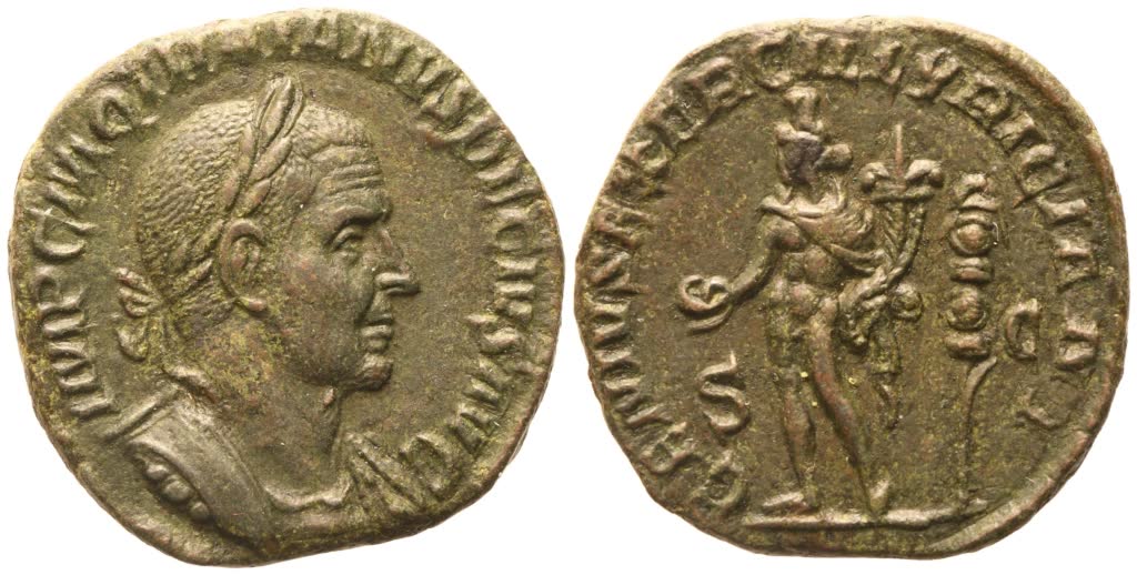 IMP C M Q TRAIANVS DECIVS AVG Laureate and cuirassed bust of Trajan Decius to r.; Rv. GENIVS EXERC ILLYRICIANI / S - C Genius standing front, head to l., holding patera in his r. hand and cornucopia in his l.; to right, signum. RIC 117a. Untouched brown patina with green undertones. Expressive portrait. Extremely fine.