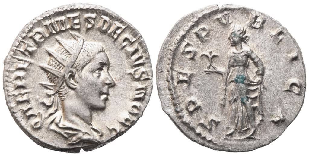 Q HER ETR MES DECIVS NOB C Radiate, draped and cuirassed bust of Herennius Etruscus to r., seen from behind; Rv. SPES PVBLICA Spes advancing l., holding flower in her r. hand and raising skirt with her l. RIC 149; Cohen 38. Extremely fine.