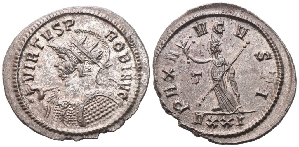 VIRTVS PROBI AVG Radiate, helmeted and cuirassed bust l., holding spear and shield, Rv. PAX AVGVSTI Pax standing l. with branch and sceptre, T to l.; mintmark VXXI in exergue. RIC 517; Cohen 427. Good extremely fine.