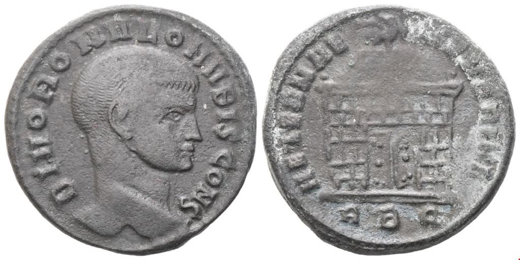 DIVO ROMVLO N V BIS CONS Bare head r.; Rv. AETERNAE – MEMORIAE Domed shrine with doors ajar surmounted by eagle; RBQ in exergue. RIC VI 207. Silvery-grey patina. Good very fine.