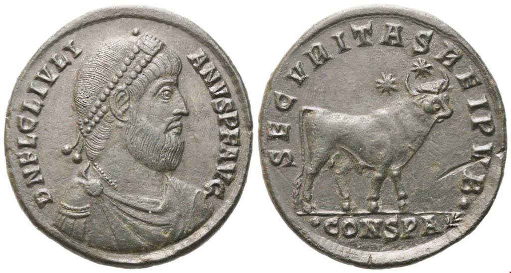 D N FL CL IVLI - ANVS P F AVG Diademed, draped and cuirassed bust r.; Rv. SECVRITAS REIPVB• Bull r.; two stars above; CONSPA (branch) in exergue. RIC VIII 161. Dark brown patina. Scratch on reverse at 3 o'clock, otherwise about extremely fine.