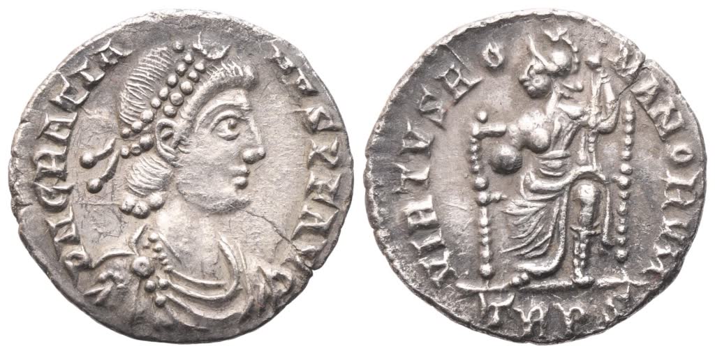 D N GRATIA - NVS P F AVG Diademed, draped and cuirassed bust r.; Rv. VIRTVS ROMANORVM Roma seated facing on throne, head l., holding globus and spear; TRPS in exergue. RIC IX 58a1. Small crack at 4 o'clock, otherwise about extremely fine.